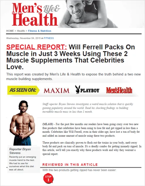 The subheading continued, “This report was created by Men’s Life & Health to expose the truth behind two new muscle-building supplements.”